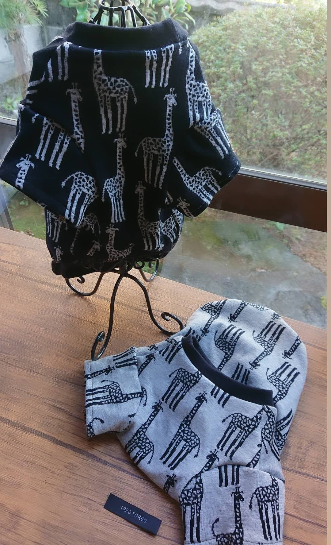黒×グレーのとってもかっこいいキリン柄のお洋服です。綿100%で柔らかく動きやすいリバーシブルニット生地です。