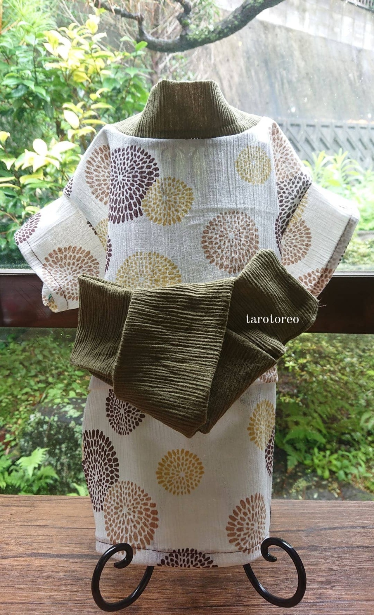 首もとの合わせ部分にスナップボタン、ウエストはマジックテープをつけますので着せやすい浴衣です。帯は蝶々結びに変更できます。