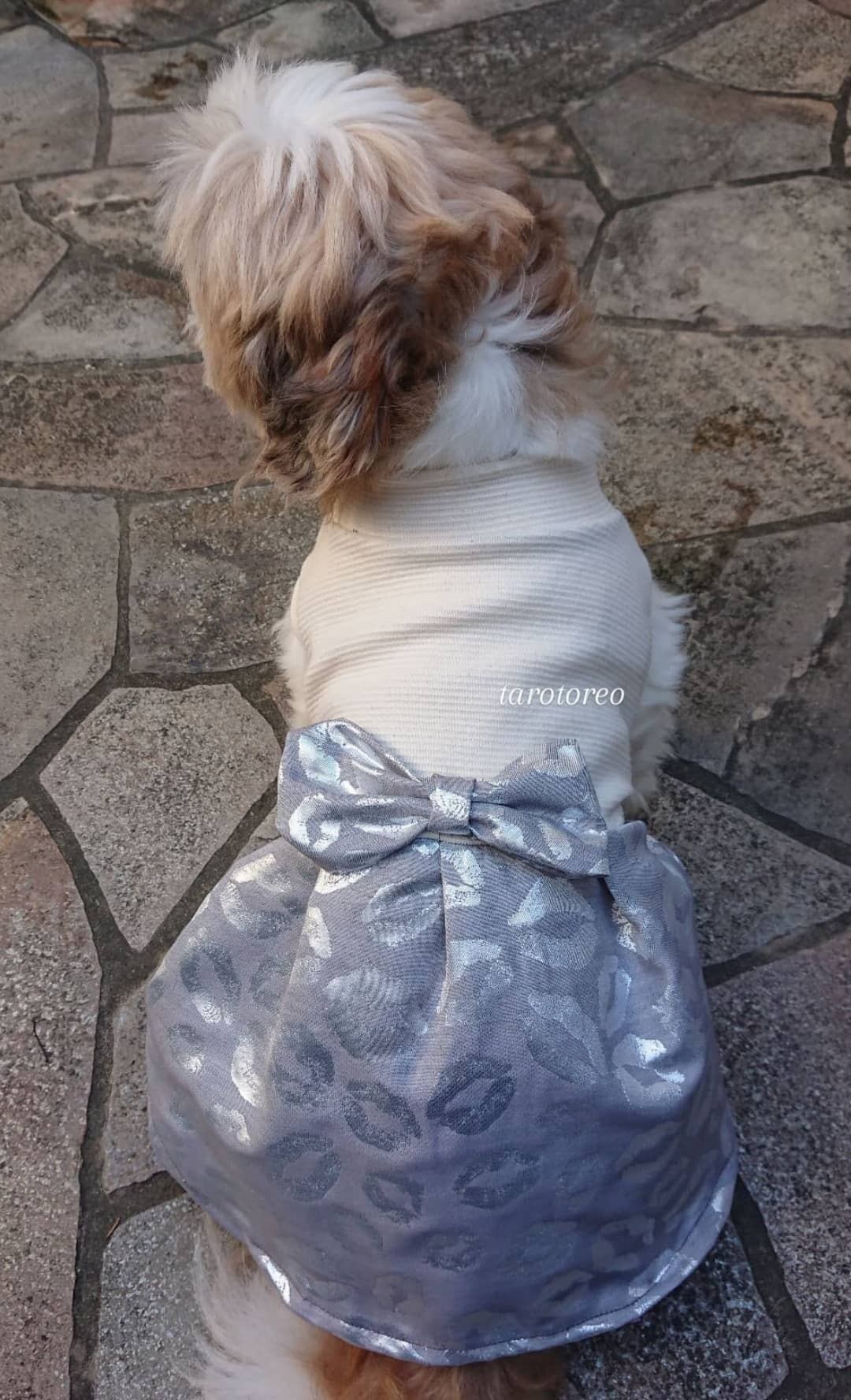 上半身、お腹側は伸縮性があるきなり色ニット、スカート部分は優しい杢スカイグレー地に、光りながら浮かび上がるシルバーリップ柄です。生地の透け感はなく柔らかく軽いです。