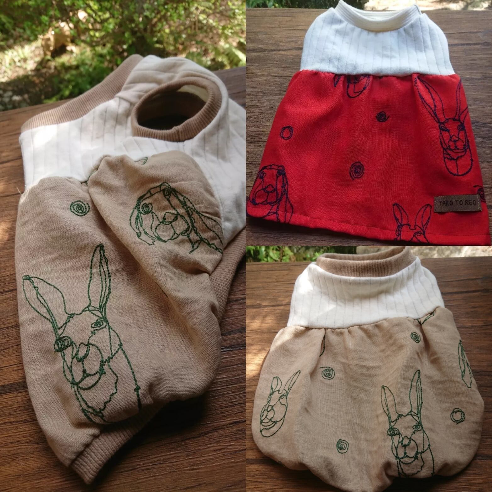 上半身とお腹側はアイボリーニット、動物刺繍部分はダブルガーゼになります。