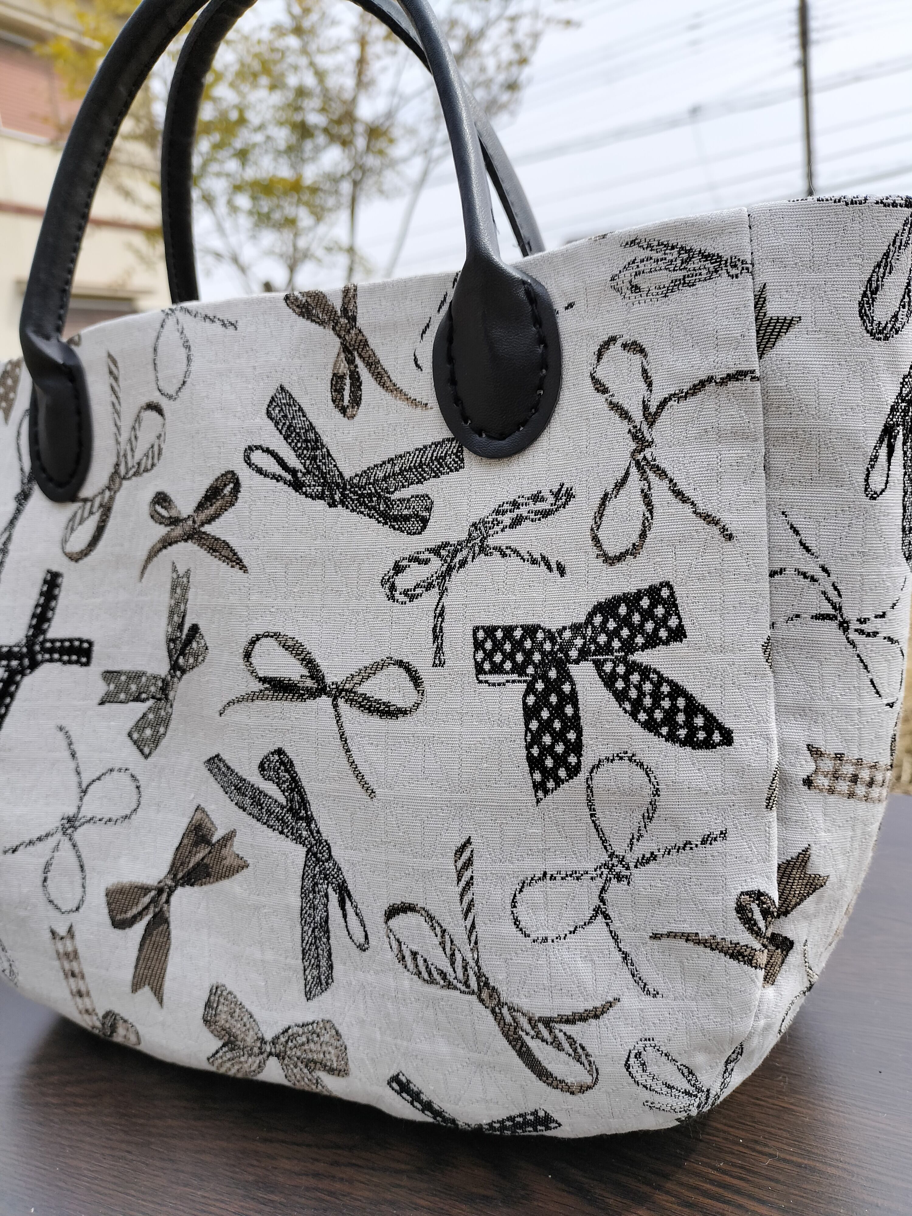 落ち着いたカラーで、上品にリボンがデザインされているスペインの生地です。
