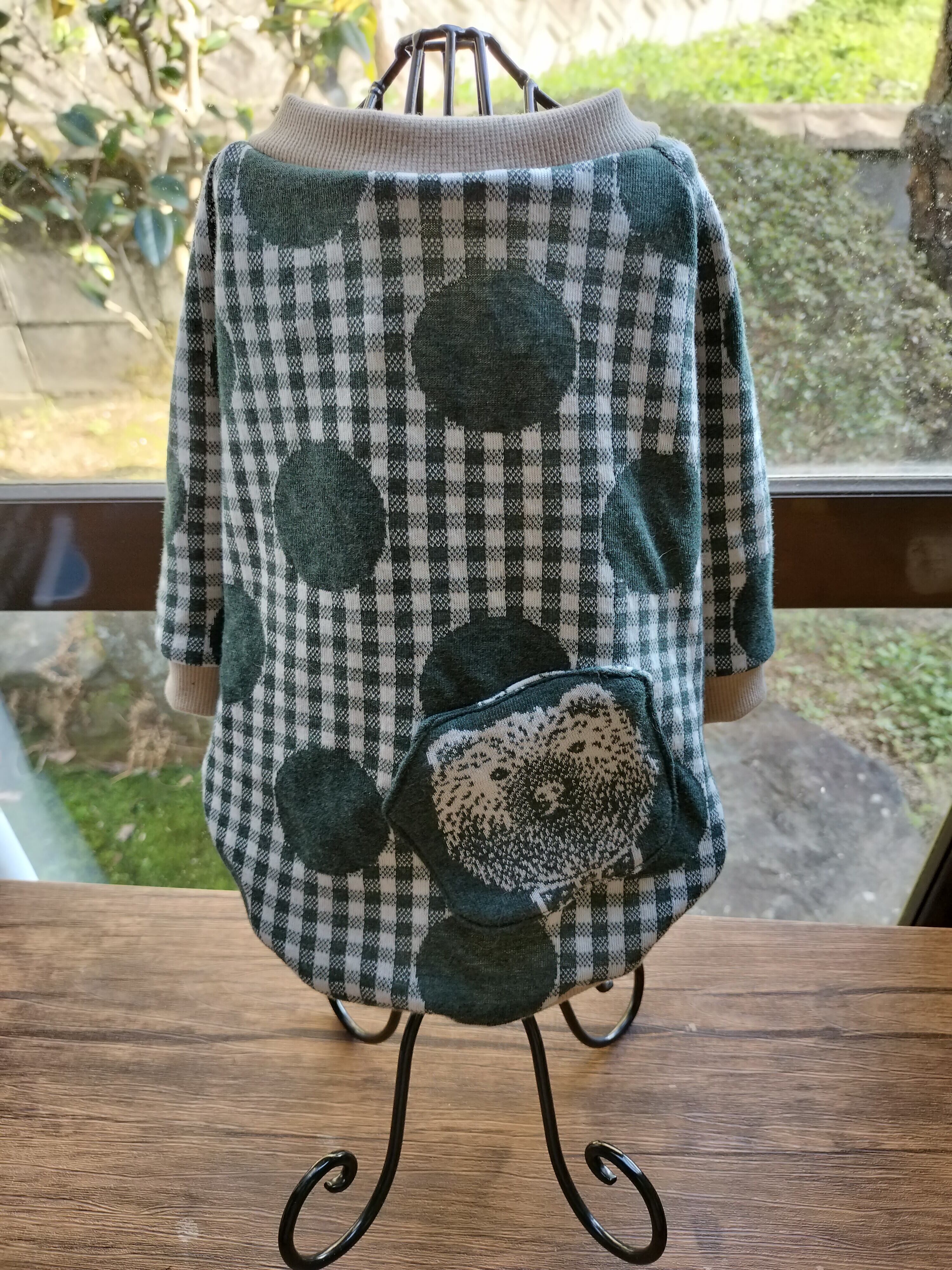 リバーシブルジャガードニット生地のお洋服です。ギンガムドット生地にポイントでかわいいベアと前側にもチョーネクタイをつけました✨